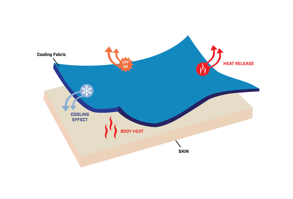 - A flat cross-structure yarn technology which offers a wide surface area to quickly transfer body heat and reflect sunlight. UPF 50 rating.